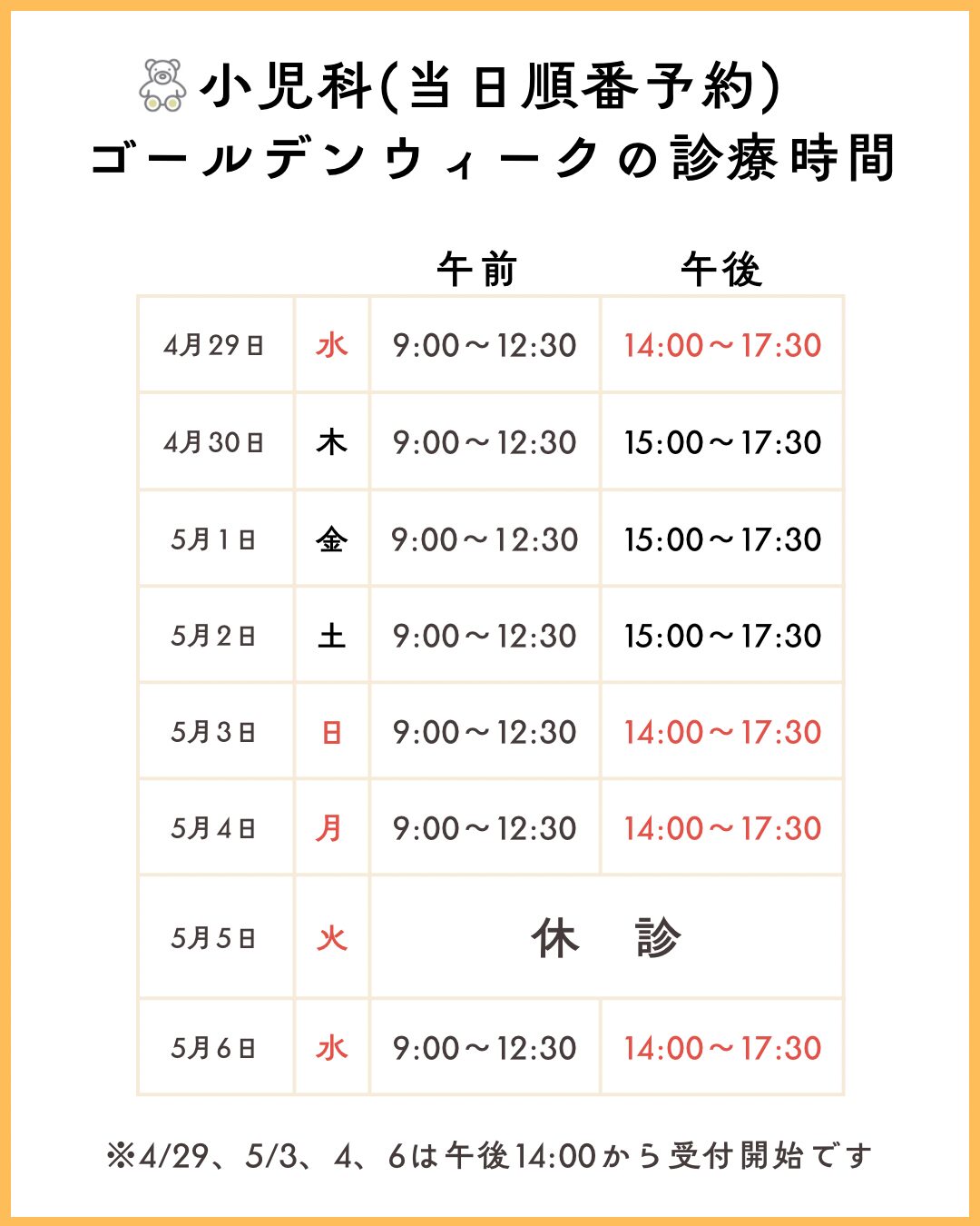 平日よりも診察が早く進むことが予想されますので、ホームページの診察状況より「診療中の番号」をご確認の上、ご来院ください。