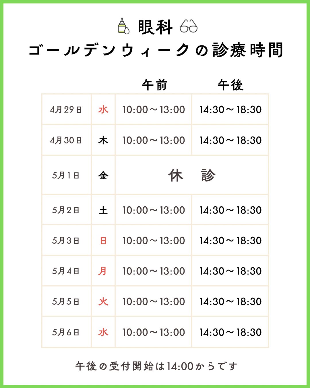- ゴールデンウィーク中の診療案内