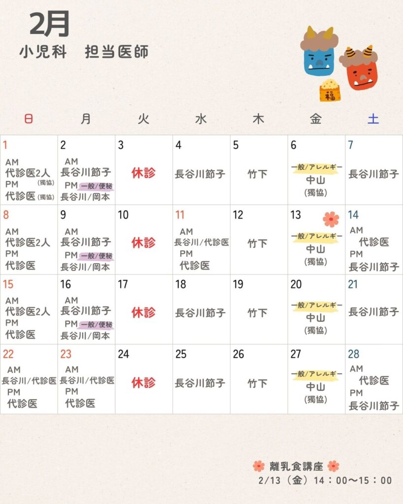 2月の1、8、15、22、23日の午前の診察は、医師2人体制で行います。
